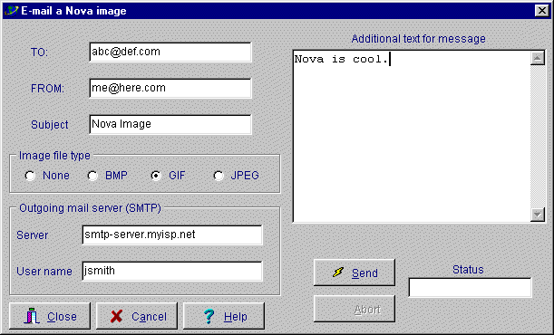 It is a good idea to test your settings by sending e-mail to yourself. Nova retains your entries so you do not have to re-enter them every session.
